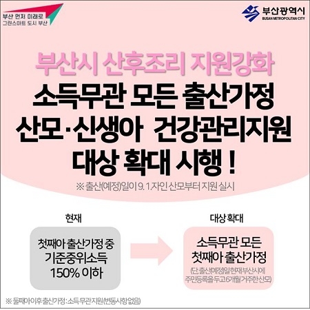 부산시가 내달 1일부터 소득수준과 상관없이 모든 출산가정에 산모와 신생아를 위한 건강관리 서비스를 지원한다고 26일 발표했다.