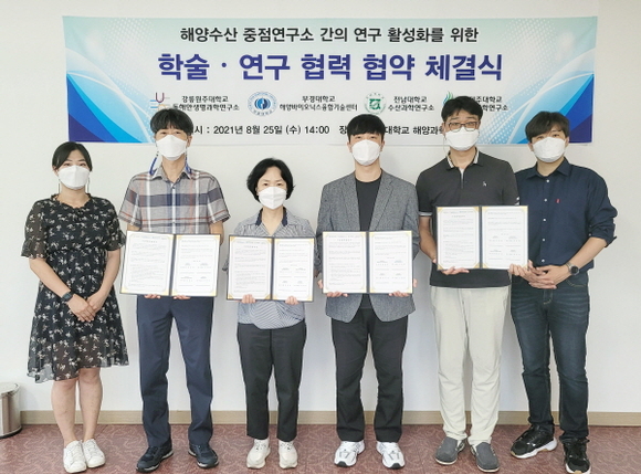 부경대학교 해양바이오닉스융합기술센터와 강릉원주대학교 동해안생명과학연구소, 전남대학교 수산과학연구소, 제주대학교 해양과학연구소 등 전국 4개 대학 해양수산 대학중점연구소가 연구협력 네트워크 구축 및 운영을 위한 업무협약을 체결했다.