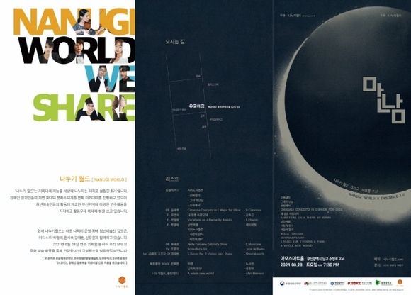이날 피아노 5중주로 가곡 ‘오빠생각’, ‘내 영혼 바람되어’, ‘낭만여행’ 그리고 영화OST ‘여인의 향기’ 등을 나눈다. 나누기월드 나해리 대표는 바이올린을, 청년예술인 강대현 씨는 피아노를 담당한다. 플루트 박형배 씨는 시각장애를, 오보에 윤세호 씨는 발달장애를 갖고 있다.