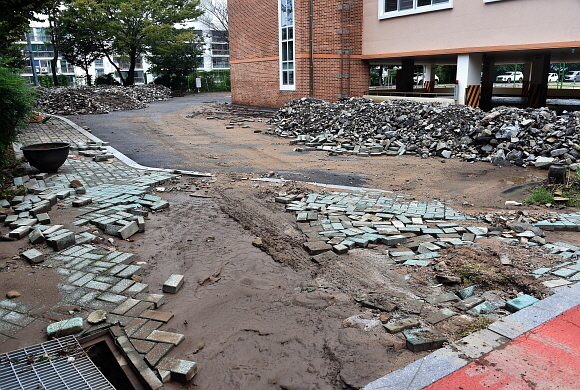 지난 25일 한반도를 관통한 올해 12호 태풍 ‘오마이스’로 인해 부산 양덕여자중학교에 토사 유출, 복도 침수 등의 피해가 생긴 것으로 확인됐다.