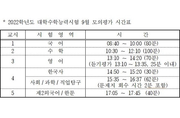 부산시교육청이 내달 1일 부산 소재 120개 고등학교와 22개 지정 학원에서 올해 마지막 예비 수학능력시험(수능)인 ‘2022학년도 수능 9월 모의평가(모평)’를 시행한다고 30일 안내했다.