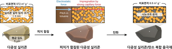 연구팀은 원유에서 추출한 피치(원유나 콜타르 등)를 증류한 뒤 남는 검은 찌꺼기)를 다공성 실리콘 내부로 균일하게 침투시키는 방식으로 이 문제를 해결했다.