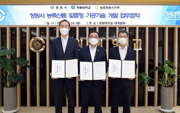시는 이날 오후 2시 창원대학교 접견실에서 창원대, 농협과 지역 농식품 가공산업 경쟁력 강화를 위한 상생 업무협약을 체결했다.