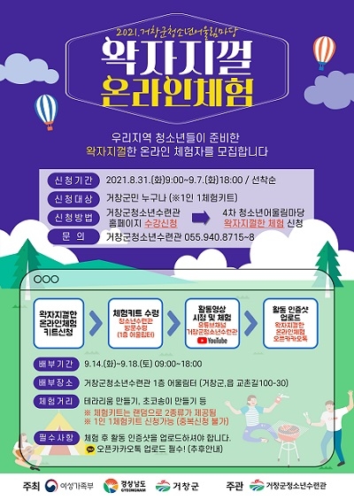 경남 거창군은 오는 31일부터 9월 7일까지 청소년수련관홈페이지를 통해 제4차 청소년어울림마당 '왁자지껄한 온라인 체험' 참가자 250명을 모집한다고 30일 밝혔다.