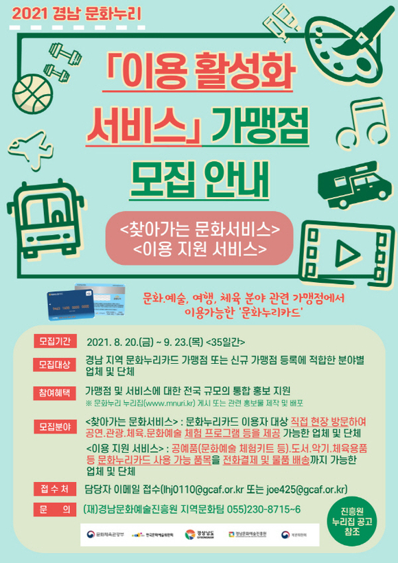 경남문화예술진흥원이 오는 9월 23일까지 문화누리카드 ‘이용 활성화 서비스’ 가맹점을 모집한다.