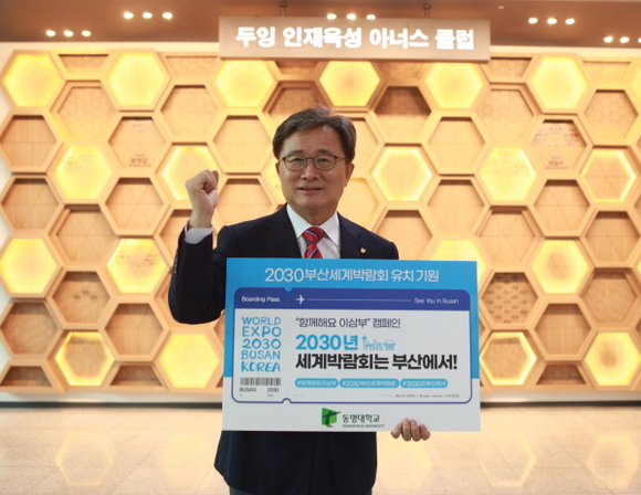 동명대학교는 전호환 총장(동남권발전협의회 상임위원장)이 2030부산세계박람회 유치를 기원하는 ‘함께해요이삼부’ 캠페인에 동참했다고 31일 밝혔다. 이삼부는 ‘2030부산세계박람회는 부산에서’를 줄인 말이다.