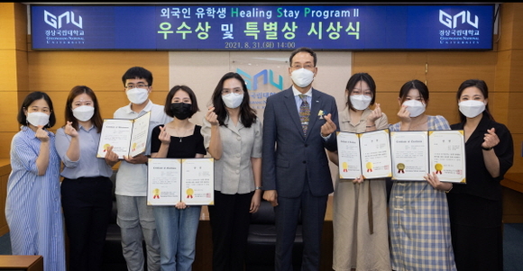 경상국립대학교(GNU)는 지난달 31일 오후 가좌캠퍼스 대학본부 3층 접견실에서 ‘비대면 힐링 스테이 프로그램Ⅱ(HSPⅡ, Healing Stay ProgramⅡ)’ 우수 학생 시상식을 마련했다.