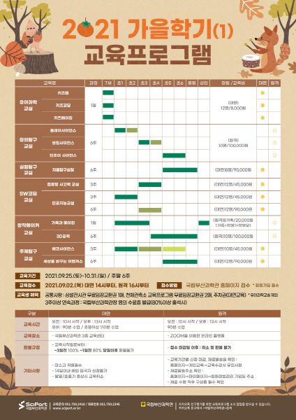 가을학기 교육프로그램은 유아과학교실, 창의탐구교실, 실험탐구교실, SW코딩교실, 창작메이커교실, 주제탐구교실 등 6개 분야 56개 프로그램으로 운영된다. 교육은 도형, 물리, 화학 등 교과영역을 중심으로 놀이나 실험을 통해 과학 원리를 이해할 수 있도록 커리큘럼을 구성했다.