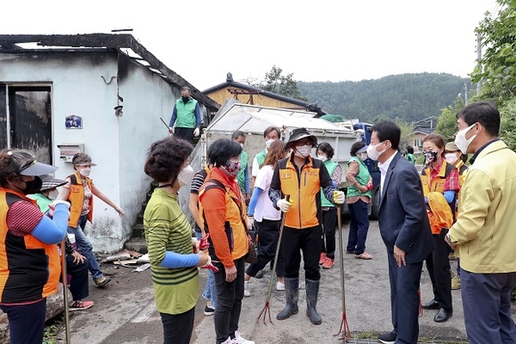 문준희 합천군수가 지난달 31일 쌍백면 원전마을 주택 화재 철거 현장에서 구슬땀을 흘리는 쌍백면 이장단을 비롯한 여러 기관사회단체 회원에게 감사의 인사와 피해자를 격려했다.