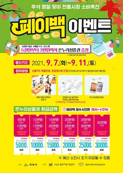 경남 밀양시가 코로나19로 침체된 전통시장 살리기의 일환으로 밀양아리랑시장에서 오는 7일부터 11일까지 '추석 명절맞이 전통시장 소비촉진 페이백 행사'를 진행한다.