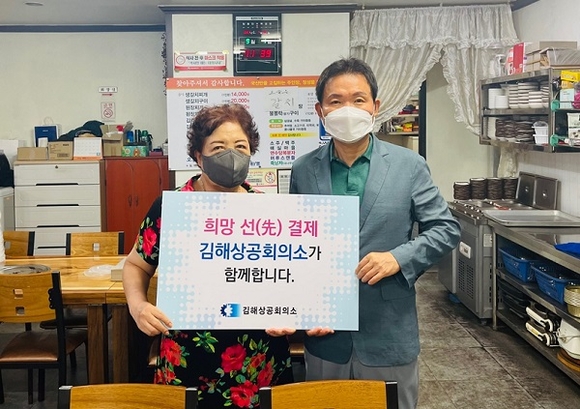 김해상공회의소가 최근 코로나19 확산과 사회적 거리두기 격상으로 어려움을 겪고 있는 소상공인들을 돕기 위해 '희망 선(先)결제 캠페인'에 동참했다.