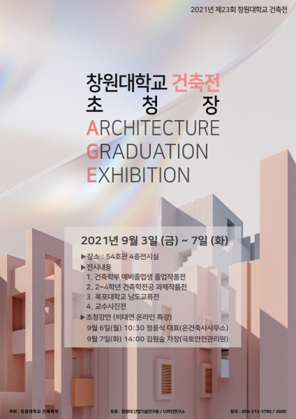 창원대학교는 오는 3일부터 7일까지 공과대학(54호관)에서 ‘제23회 건축학부 건축전’을 개최한다고 2일 밝혔다. 주요 전시내용은 건축학부 졸업작품과 학부생 과제작품, 남도건축교류전, 교수사진전 등이다.
