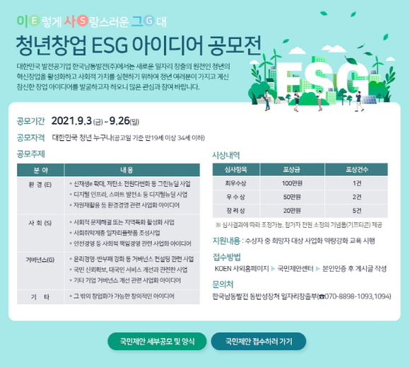 한국남동발전은 ESG경영과 연계한 혁신적 청년창업가 육성으로 청년 일자리 창출에 기여하기 위해 ‘청년창업 ESG 아이디어 공모전’을 시행한다고 3일 밝혔다.