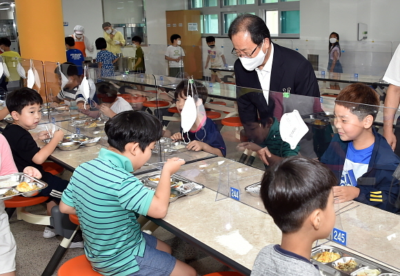 2학기 학사 일정이 시작된 가운데 지난 2일 김석준 부산시교육감이 수영구 배산초등학교를 방문해 급식실 방역 상태 등을 살펴보고 있다. 부산시교육청에 따르면 이날 김석준 시교육감은 연제구 소재 ‘토현초’ ‘이사벨중’, 수영구 소재 ‘배산초’, 동래구 소재 ‘동해중’을 잇따라 방문해 학사일정과 방역상황을 점검했다. (사진=부산시교육청 제공)