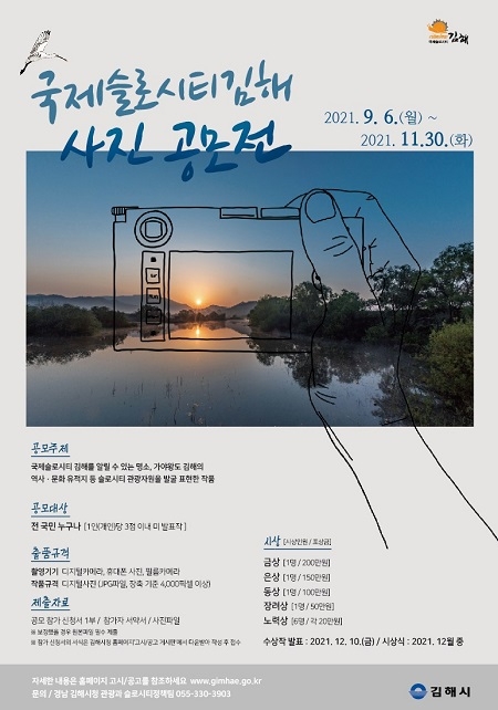 시 관계자는 “김해는 우리나라 최초의 도시형 슬로시티로서 지역경제, 자연, 역사문화, 사람의 조화로움을 추구한다”며 “이러한 국제슬로시티 김해의 매력을 알릴 수 있는 유익한 사진들이 많이 접수되기를 바란다”고 말했다.