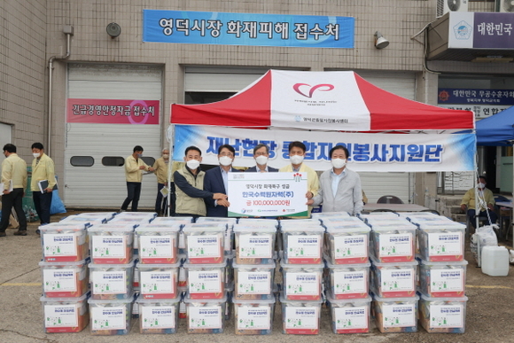 한국수력원자력(이하 한수원)이 화재로 큰 피해를 입은 경북 영덕군 영덕시장 상인들을 위해 6일 성금 1억원과 긴급구호키트를 전달했다.