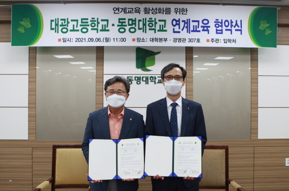 동명대학교와 대광고등학교는 6일 동명대에서 전문인력 양성을 위한 연계교육 협약을 체결했다. 협약은 학령인구 감소와 교육환경 변화에 능동 대처하고 지역사회 전문인력 양성을 위한 협력체계 구축을 위해 추진됐다.