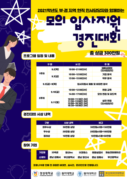 경성대학교 대학일자리센터는 2021학년도 부산·경남 지역 현직 인사담당자와 함께하는 ‘모의 입사지원 경진대회’를 온라인으로 개최했다고 밝혔다.