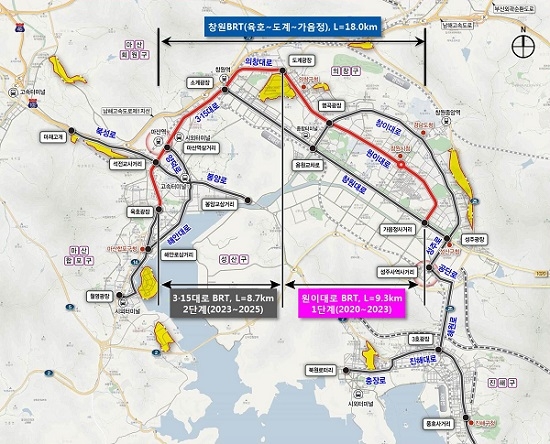 ◇향후 계획= 향후 BRT를 위한 절차로는 창원광장과 자전거도로 처리 방안 등에 대한 시민토론회를 10월경 시행할 계획이며, 12월경에 전반적인 계획안에 대한 주민설명회를 권역별로 시행해 주민들의 의견을 듣고 교통체계 개선에 따른 교통안전심의를 거쳐 내년 5월경 경남도에 실시계획 승인신청을 할 계획이다. 이후 사업자 선정을 통해 내년 하반기에 착공, `23년 하반기에는 원이대로(도계광장~가음정사거리, L=9.3km) 구간에 S-BRT체계 운영이 가능할 것으로 보인다.