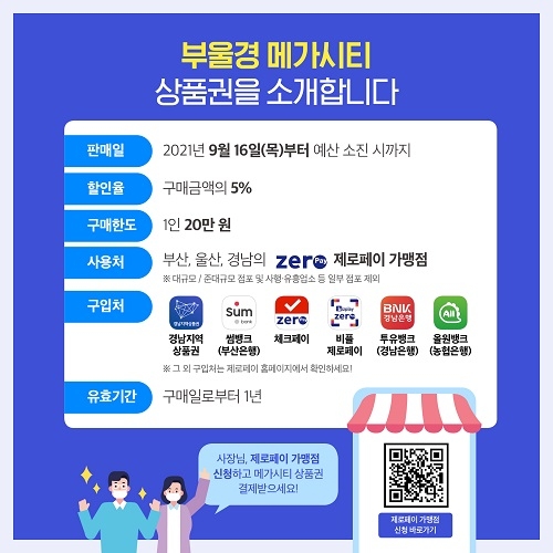 한편 메가시티 상품권 관련 자세한 사항은 제로페이 상품권 앱(비즈플레이, 경남지역상품권, 부산은행, 농협 올원뱅크 등) 공지사항에서 확인할 수 있다.
