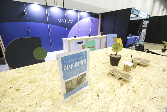 또 부산지역 자활센터와 연계해 제작된 커피박화분뿐 아니라 골판지로 만든 여러 색깔의 벽체와 안내물, 종이로 된 현수막, 친환경 카페 용품 등도 여럿 전시하고 있다.