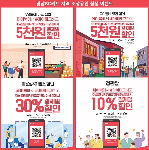 한정안 카드사업부장은 “코로나19로 어려움을 겪고 있는 지역 소상공인들과 상생하고 경남BC카드 회원들에게 할인 혜택을 제공하고자 경남BC카드 지역 소상공인 상생 이벤트를 진행한다. 특히 마트와 음식점 그리고 미용실 등 생활과 밀접한 소상공인 가맹점에서 진행되는 만큼 경남BC카드 회원들의 많은 참여 바란다”고 말했다.