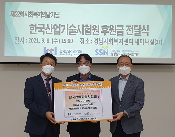 한국산업기술시험원(이하 KTL)은 지역 취약계층의 복지증진을 위해 후원금(300만원)과 포도 100여 상자를 경남사회복지협의회(이하 협의회)에 전달했다고 9일 밝혔다.