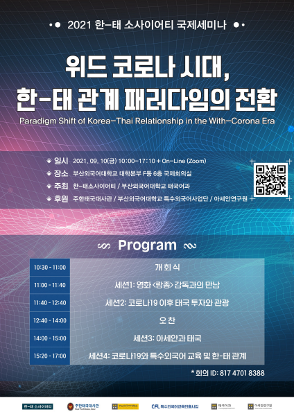 이번 국제세미나는 △영화 ‘랑종’ 감독과의 만남 △코로나19 이후의 태국 투자와 관광 △아세안과 태국 △코로나19와 태국어 교육 및 한-태 관계라는 주제로 크게 4부로 구성된다.