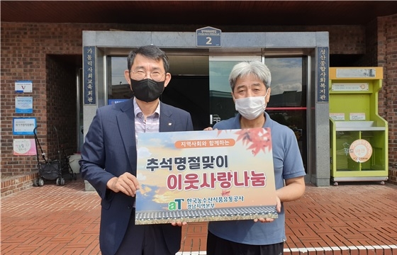 한국농수산식품유통공사(aT) 경남지역본부는 추석 명절을 맞아 지역사회 소외이웃을 돕고, 지역 농산물 소비활성화를 위해 9일 사회복지시설인 창원성산종합복지관과 동보원을 방문해 온누리상품권을 전달했다.