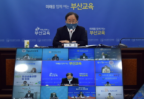 지난 13일 오후 ‘제80회 전국시도교육감협의회 총회’가 화상회의로 열린 가운데 김석준 부산시교육감이 시교육청 제1회의실에서 화상 총회에 참석해 발언하고 있다. 부산시교육청에 따르면 이날 비대면 화상으로 진행된 총회에서는 ‘대학수학능력시험 개선안’에 대한 교육 의제로 토의가 진행됐다. (사진=부산시교육청 제공)