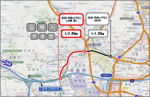 경남 김해시는 추석 연휴 전인 15일 시의 동서축인 지방도 1042호선(외동~주촌) 확포장공사 구간 중 골든루트교차로~후포박스 구간(1㎞) 4차로를 우선 개통한다고 14일 밝혔다.