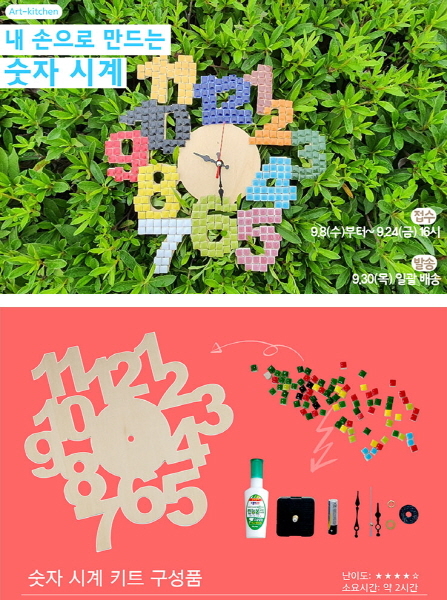 ‘숫자시계 키트’의 구성품은 숫자 시계판, 미니타일 12봉, 목공용풀, 시계 무브먼트와 시곗바늘, 건전지로 구성된다. 판매금액은 2만원으로 선착순 50개 한정판매로 진행되며 9월 마지막 주 일괄 배송될 예정이다.