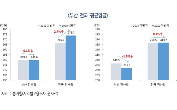 먼저 임금 수준을 보면 지난해 상반기 부산지역은 3개월 평균 임금이 전년동기 대비 2000원 수준의 미세한 하락을 보였으나 지난해 하반기에는 4만 7000원이 하락하며 감소폭이 확대됐다.