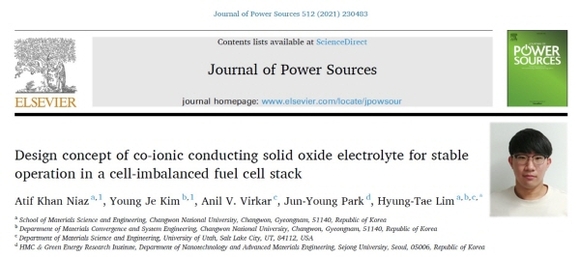 제목은 ‘수소연료전지 내구성 향상을 위한 신개념 다상 혼합이온전도체 고체산화물 전해질에 관한 연구(Design concept of co-ionic conducting solid oxide electrolyte for stable operation in a cell-imbalanced fuel cell stack)’다.