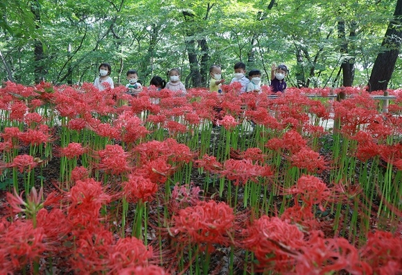15일 경남 함양군 상림공원을 찾은 어린이들이 활짝 핀 꽃무릇을 감상하고 있다. (사진=함양군 제공)