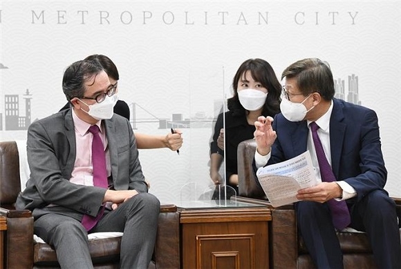 지난 15일 오후 르노그룹 프랑수아 부회장(왼쪽)이 부산시청을 방문한 가운데 박형준 부산시장과 만나 미래차 산업 생태계 구축 등에 대해 논의하고 있다. (사진=부산시 제공)
