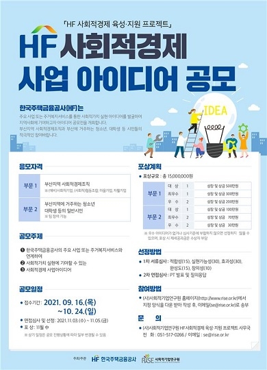 한국주택금융공사(주금공)가 부산지역의 사회적경제 활성화를 위해 ‘사회적경제 사업 아이디어 공모전’을 개최한다고 16일 공고했다.