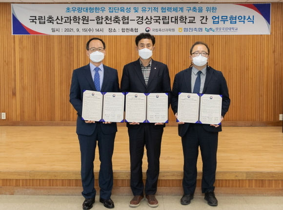 경상국립대학교(GNU)와 농촌진흥청 국립축산과학원, 합천축협은 ‘초우량대형한우 집단 육성’을 위한 업무협약을 지난 15일 합천축협에서 맺었다.