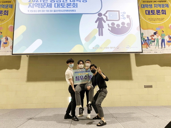 인제대학교 LINC+사업단은 울산전시컨벤션센터에서 열린 ‘2021년 동남권 대학생 지역문제 대토론회’에서 제약공학과 어방동클라스(김동명·여희구·정시현·정찬진)팀이 최우수상(울산대학교 총장상)을 수상했다고 17일 밝혔다.
