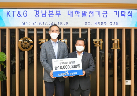창원대학교는 KT&G 경남본부가 17일 대학본부에서 KT&G 상상펀드 전달식을 갖고, 총 1000만 원의 장학금을 대학에 전달했다고 밝혔다.