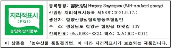 함양산양삼 협회 영농조합법인은 2019년 최초 함양산양삼 지리적 표시등록을 신청하여 2년에 걸쳐 철저한 서류 심사와 현장 검증 등을 통해 이날 최종 임산물 지리적표시제에 등록됨으로서 함양산양삼의 브랜드 인지도 상승에 많은 기대를 하고 있다.