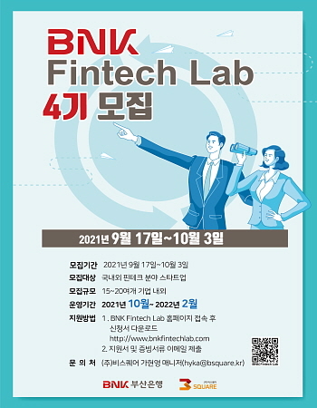 BNK부산은행이 핀테크 분야 스타트업을 발굴, 육성하기 위한 ‘BNK핀테크랩’의 4기 참여기업을 모집 중이라고 24일 밝혔다.