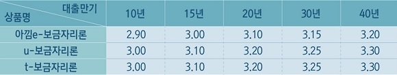 또 전자약정 등 온라인으로 신청해 비용을 절감할 수 있는 ‘아낌e-보금자리론’은 0.10%p 낮은 연 2.90%(만기 10년)에서 최대 3.20%(40년)의 금리가 적용된다.