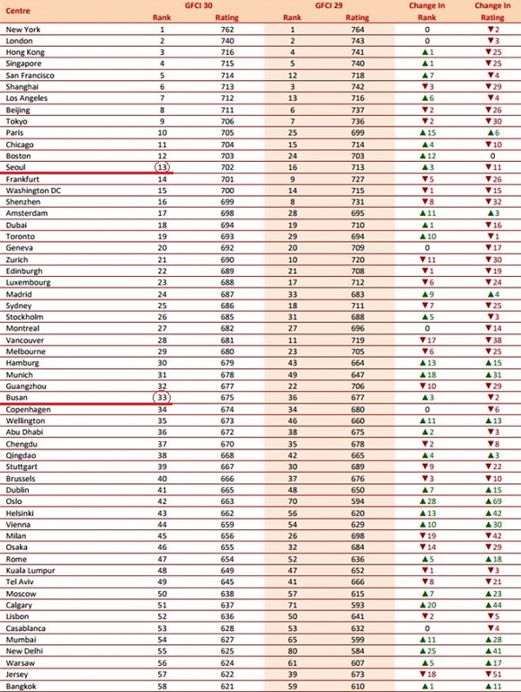 이를 살펴보면 뉴욕과 런던이 변함없이 1위와 2위를 차지했으며 뒤이어 홍콩과 싱가포르가 3위와 4위로 각각 한 계단씩 상승했다. 우리나라의 도시 가운데서는 서울이 13위로 가장 높은 순위에 올랐으며 부산이 그 뒤를 이었다.
