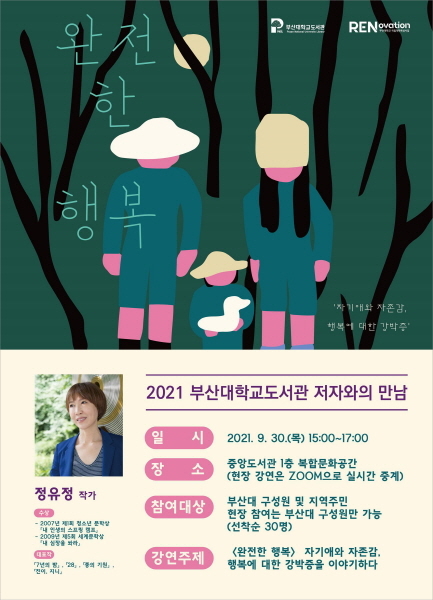 부산대학교 도서관은 오는 30일 오후 3시부터 2시간 동안 교내 중앙도서관 1층 복합문화공간에서 ‘완전한 행복 자기애와 자존감, 행복에 대한 강박증을 이야기하다’를 주제로 정유정 작가를 초청해 ‘저자와의 만남‘을 개최한다고 28일 밝혔다.