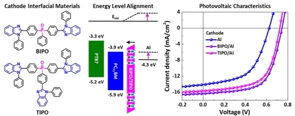 수 나노미터 두께로 코팅된 유기단분자 계면물질은 포스핀 옥사이드 작용기가 강한 쌍극자를 유발하고, 벤조이미다졸 작용기가 음극에 사용되는 금속과 결합해 음극의 일함수(work function)을 낮춰 광활성층과 음극의 에너지 장벽을 없애 효율적인 전자의 수집을 유도했다.