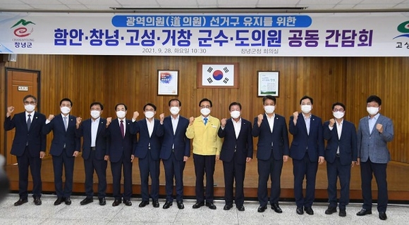 28일 창녕군청에서 구인모 거창군수, 조근제 함안군수, 한정우 창녕군수, 이기봉 고성부군수와 4개군 도의원 8명이 모여 간담회를 개최했으며, 광역의원 2석 유지를 위한 단일행동 방안 모색과 전 군민들의 의사가 반영될 수 있도록 다각적인 표출 방법도 논의했다.