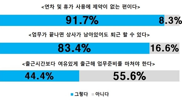 조사 결과에 따르면 부산의 매출 상위 기업들의 조직문화는 과거 경직된 수직적 분위기에서 벗어나 대체로 유연하고 수평적인 문화로 자리잡고 있는 것으로 확인된다. 응답한 직장인 가운데 91.7%가 ‘연차, 휴가 사용에 제약이 없다’고 응답했으며 83.4%는 ‘퇴근시간대 업무가 끝나면 상사가 퇴근 안 해도 먼저 퇴근할 수 있다’고 응답했다.