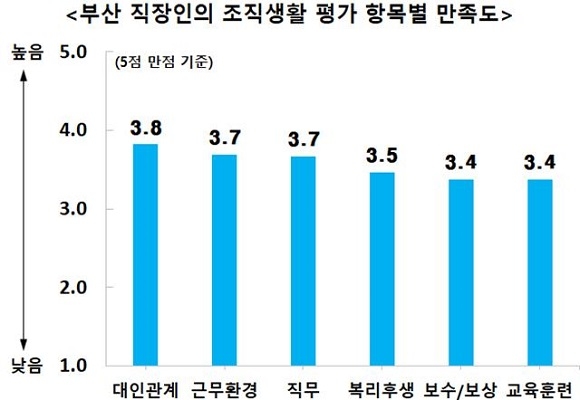 이외에도 부산지역 기업의 업무문화에도 일부 개선이 필요한 것으로 조사됐다. 응답자가 평가한 기업문화 항목(5점 만점) 중 ‘효율성(2.5점)’ ‘자율성(3.2점)’ ‘지시 명확성(3.3점)’ 등이 낮은 평점을 받으며 업무에 대한 정보전달이 명확하지 않은 경우가 있다고 지적됐다.