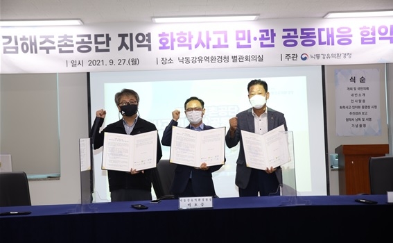 낙동강유역환경청은 지난 27일 청사 대강당에서 김해 주촌공단 주요 유해화학물질 취급업체 13개사 대표와 화학사고 예방, 신속한 대응·수습을 위한 '민·관 공동대응 업무협약'을 체결했다.